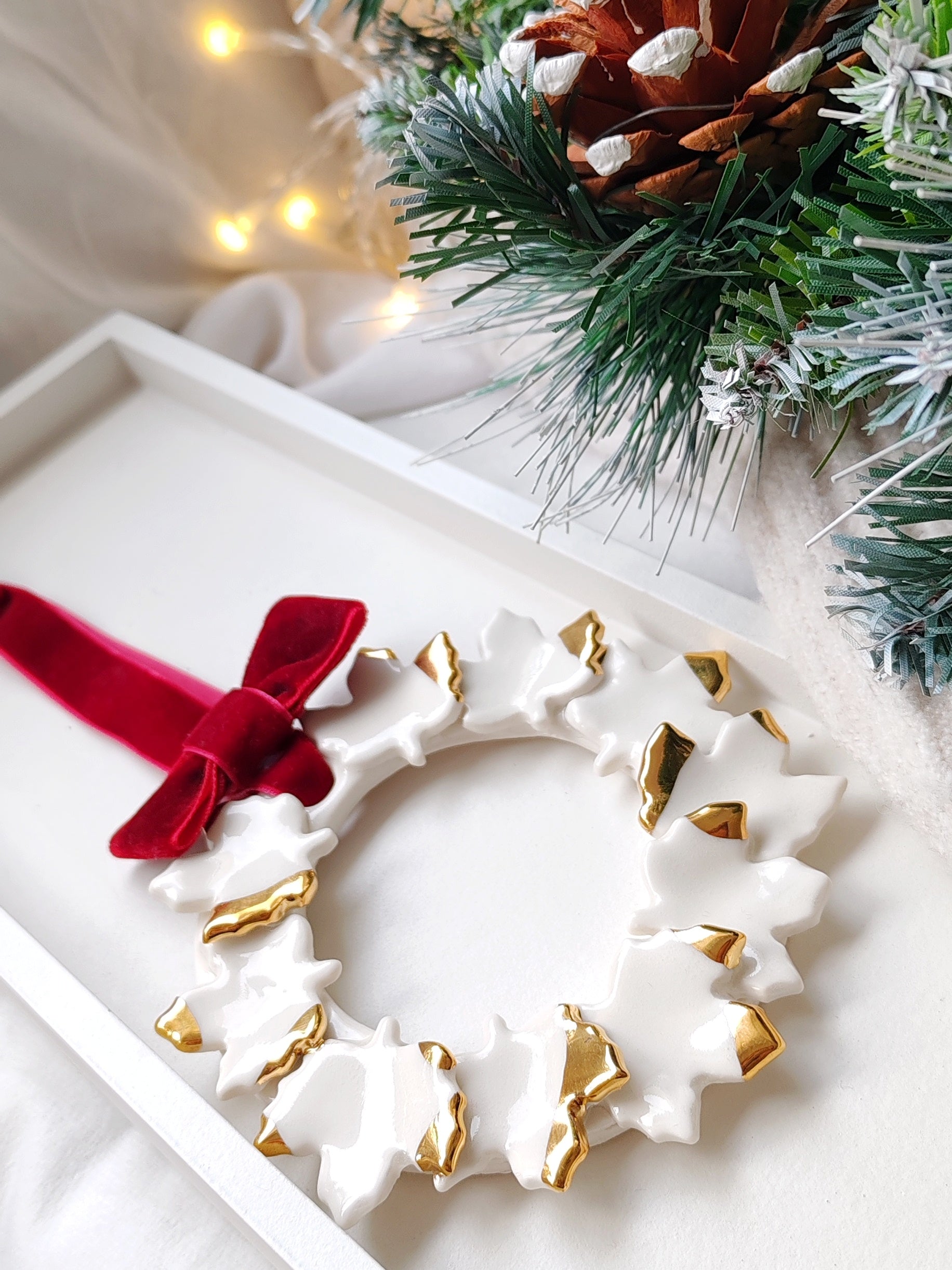 Porcelanski venčić sa hrastovim listovima, oplemenjenim tečnim zlatom. Ovaj komad je napravljen da vas inspiriše – bilo da ga poklonite nekome dragom ili postavite kao ukras u vašem domu tokom novogodišnjih praznika. Svaki detalj je pažljivo oblikovan da vam donese radost i osećaj povezanosti sa prirodom. Jednostavan, topao i pun značaja – upravo onakav kako bi trebalo da bude nešto što vas čini srećnim.