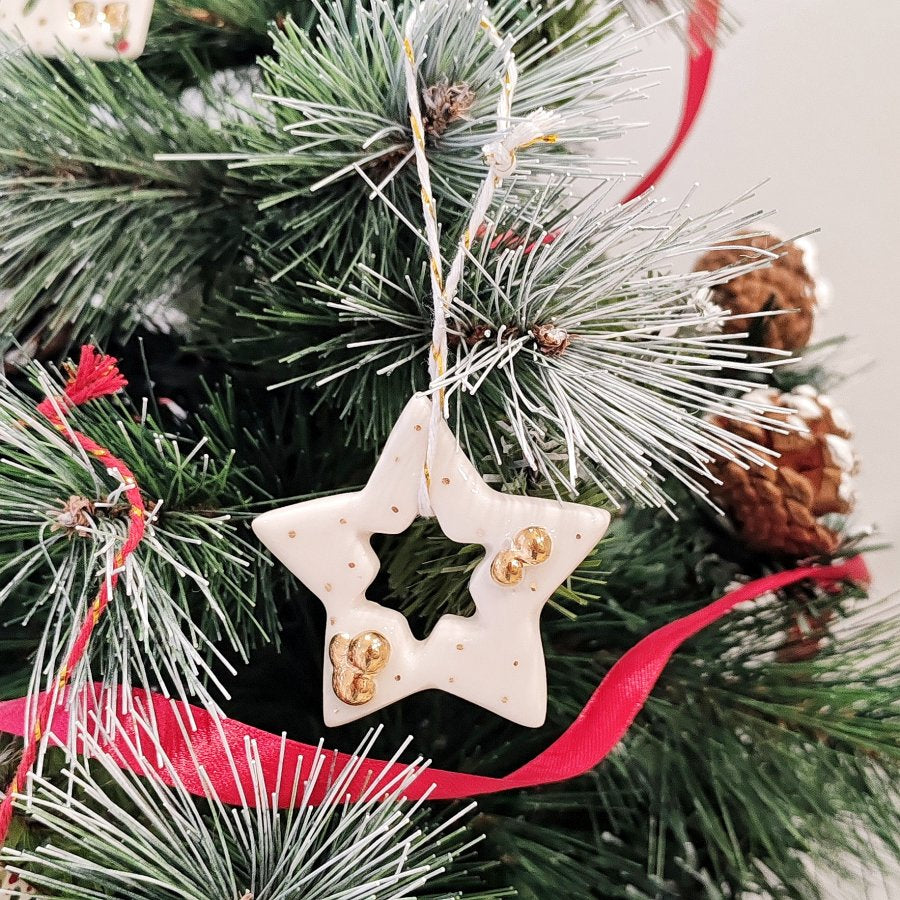 Zasijaj sa ovim setom od tri bele porcelanske zvezde koje svetlucave kao pravi dijamanti! Svaka zvezda ima sjajan završetak sa zlatnim detaljima koji dodaju luksuznu notu. Bonus – dobijаš i dve male zvezdice kao poklon. Savršeno za tvoju jelku, ili kao dar dragoj osobi.