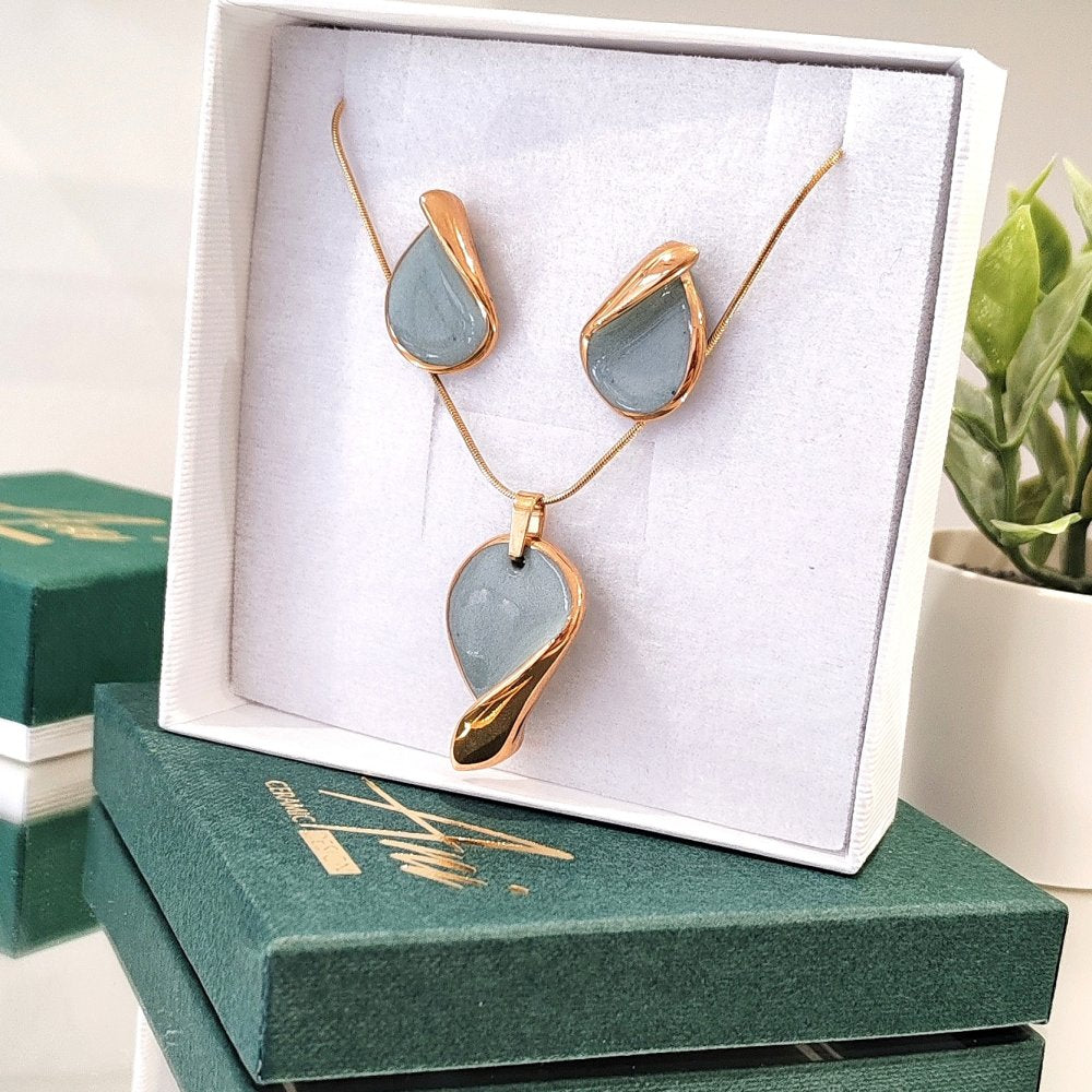Ovaj porcelanski set minđuša i ogrlice u obliku kapljica u mint roze boji oplemenjen je 14k pozlatom, pružajući sofisticiran i elegantan izgled. Sajla je izrađena od hirurškog čelika, što garantuje antialergijska svojstva, jednako kao i iglice na minđušama. Savršen za svakodnevnu upotrebu i posebne prilike.