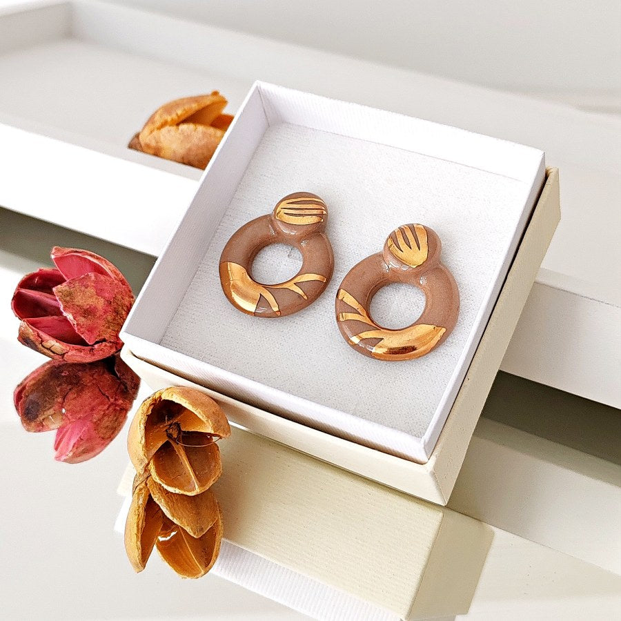 Ove lagane porcelanske minđuše u obliku kruga, u elegantnoj braon boji, ukrašene su 14k pozlatom koja im daje suptilan sjaj. Savršene su za svakodnevno nošenje, jer su udobne i jednostavne za kombinovanje sa različitim stilovima, pružajući vam diskretan, ali upečatljiv detalj.
