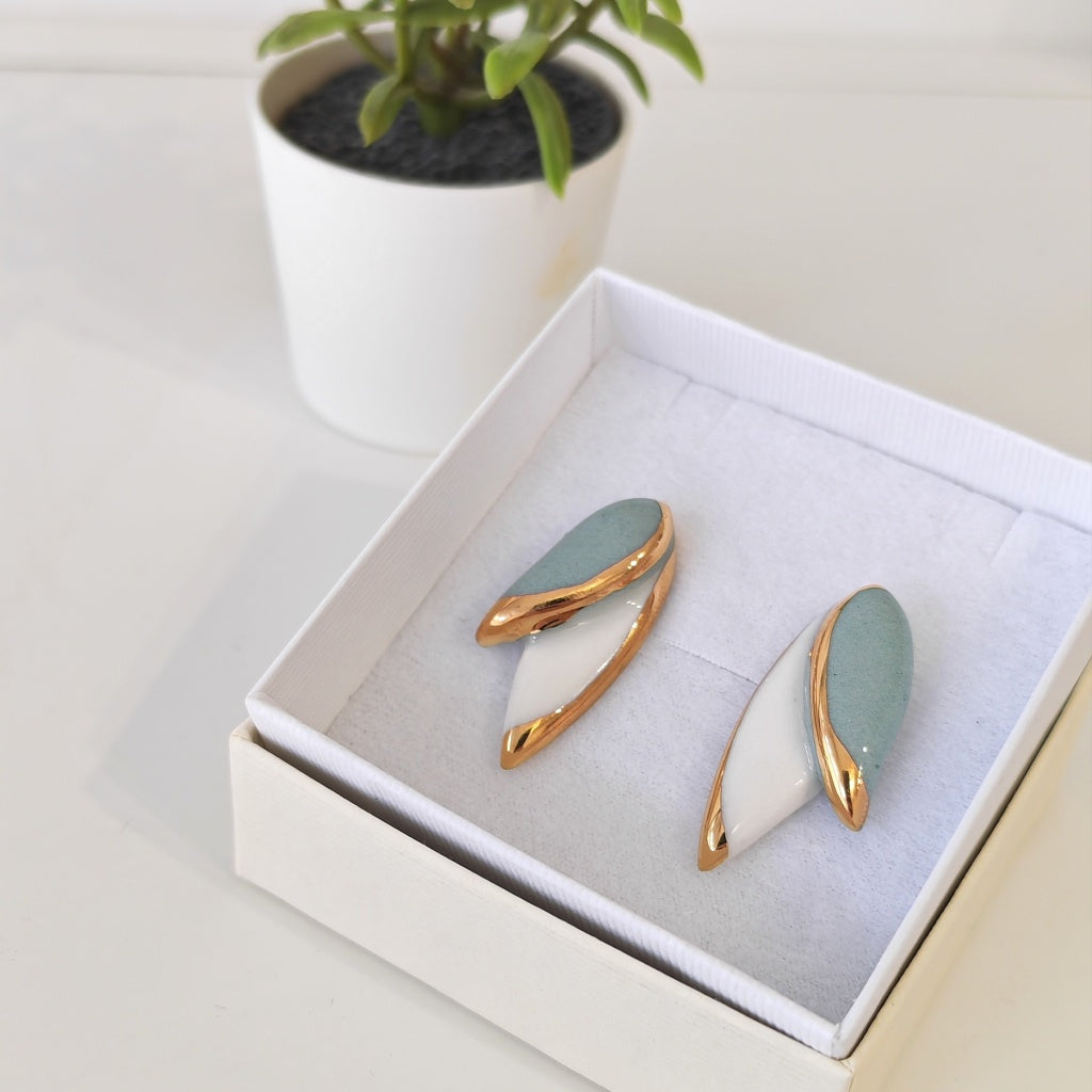 Ove lagane porcelanske mindjuše u nežnim mint i belim tonovima oplemenjene su zlatom od 14k, pružajući vam elegantan i sofisticiran detalj uz osećaj udobnosti tokom celog dana. Savršen izbor za one koji traže diskretan, ali stilski dodatak svakom izgledu.