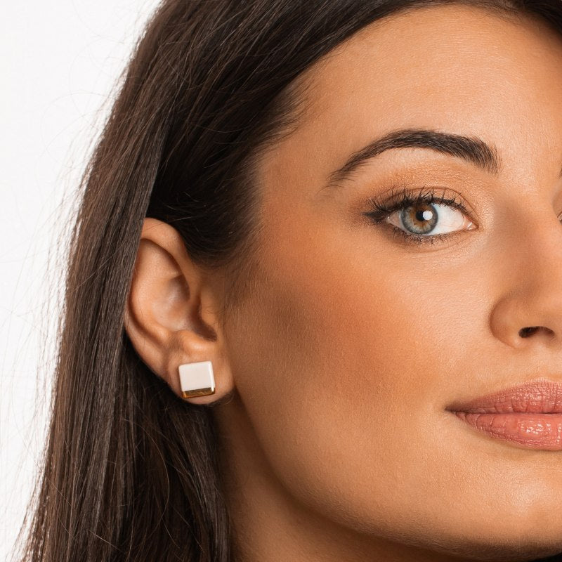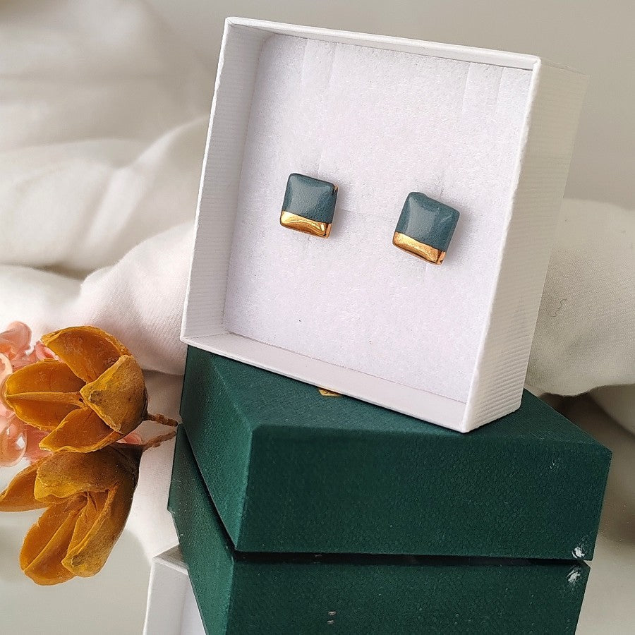 Male kvadratne minđuše u nežnoj tirkiznoj boji sa 14k zlatnim detaljima. Savršeni za svakodnevno nošenje, ovi porcelanski Lagani, udobni i dovoljno mali da se slažu sa bilo čim. Jednostavna elegancija koja govori sama za sebe.
