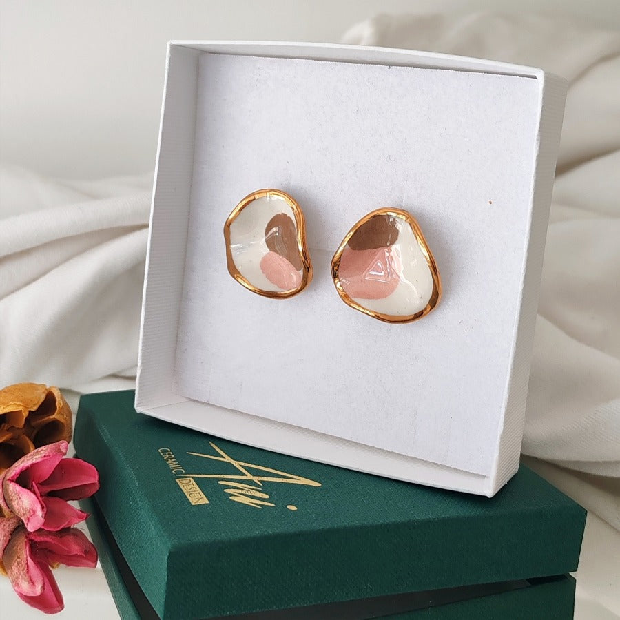 Ove lagane porcelanske minđuše, uokvirene 14k pozlatom, imaju oblik latice koji odiše elegancijom. Savršene su za svečane prilike, dodajući suptilan i sofisticiran detalj vašem izgledu bez opterećenja. Idealne su za one koji traže jedinstveni, ali diskretan nakit.