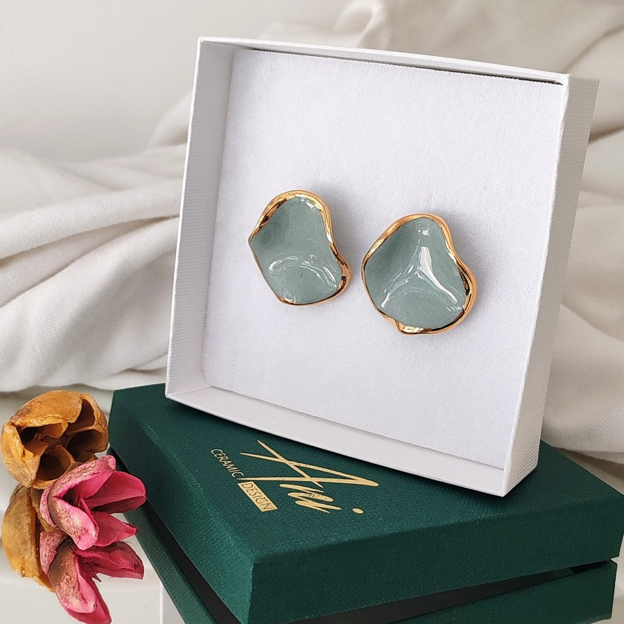 Ove lagane porcelanske minđuše u Mint boji, uokvirene 14k pozlatom, imaju oblik latice koji odiše elegancijom. Savršene su za svečane prilike, dodajući suptilan i sofisticiran detalj vašem izgledu bez opterećenja. Idealne su za one koji traže jedinstveni, ali diskretan nakit.
