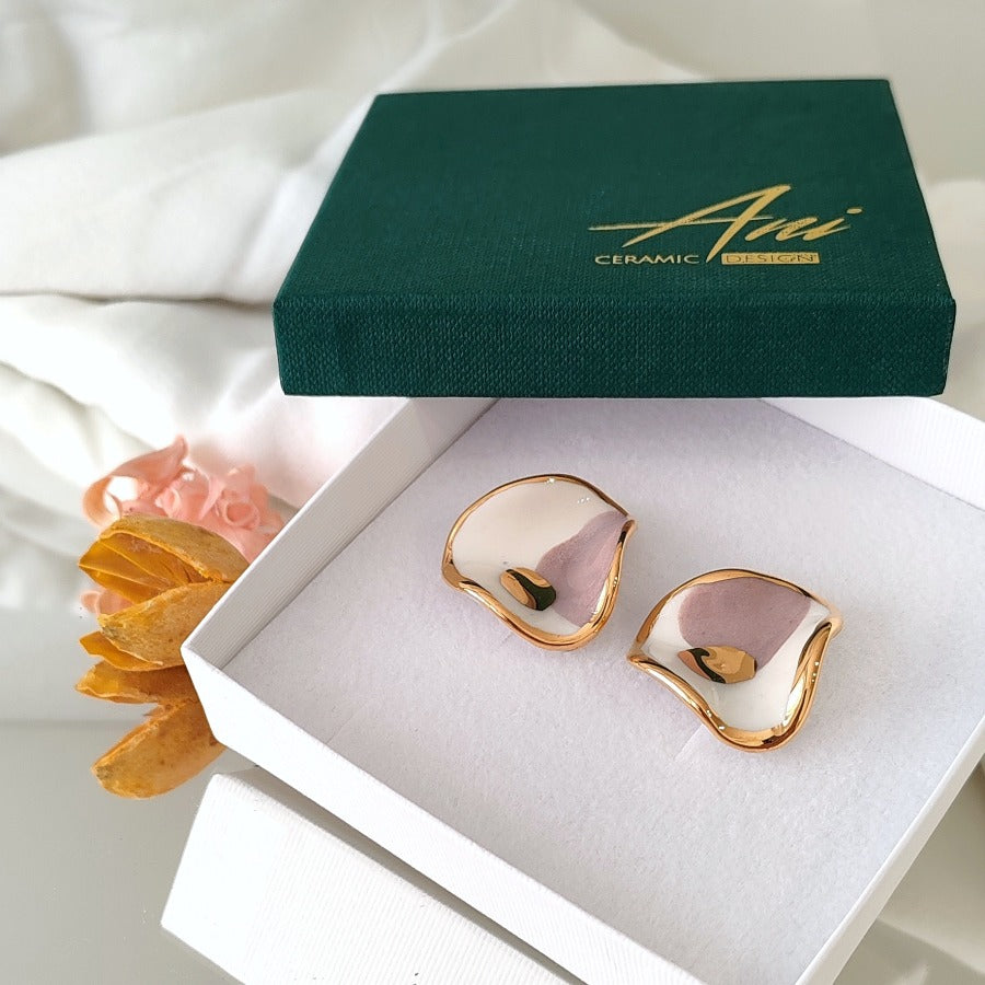 Ove lagane porcelanske minđuše u bež-beloj boji, uokvirene 14k pozlatom, imaju oblik latice koji odiše elegancijom. Savršene su za svečane prilike, dodajući suptilan i sofisticiran detalj vašem izgledu bez opterećenja. Idealne su za one koji traže jedinstveni, ali diskretan nakit