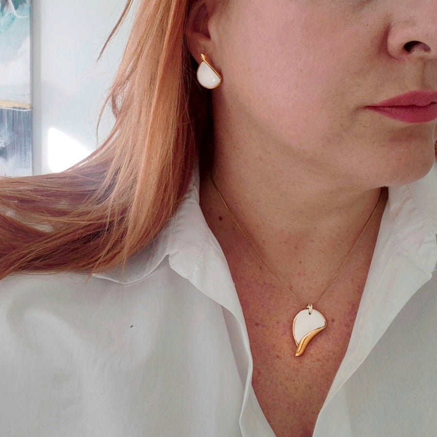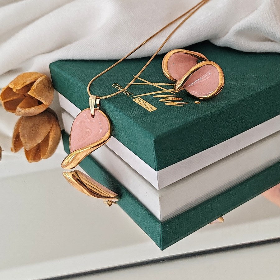 Ovaj porcelanski set minđuša i ogrlice u obliku kapljice u roze boji oplemenjen je 14k pozlatom, pružajući sofisticiran i elegantan izgled. Sajla je izrađena od hirurškog čelika, što garantuje antialergijska svojstva, jednako kao i iglice na minđušama. Savršen za svakodnevnu upotrebu i posebne prilike.