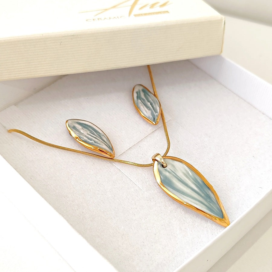 Ovaj porcelanski set minđuša i ogrlice u obliku kapljice u roze boji oplemenjen je 14k pozlatom, pružajući sofisticiran i elegantan izgled. Sajla je izrađena od hirurškog čelika, što garantuje antialergijska svojstva, jednako kao i iglice na minđušama. Savršen za svakodnevnu upotrebu i posebne prilike.