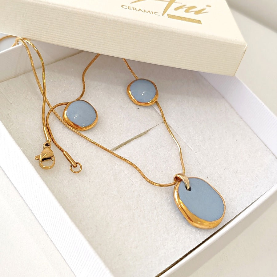 Ovaj porcelanski set minđuša i ogrlice u obliku kapljice u roze boji oplemenjen je 14k pozlatom, pružajući sofisticiran i elegantan izgled. Sajla je izrađena od hirurškog čelika, što garantuje antialergijska svojstva, jednako kao i iglice na minđušama. Savršen za svakodnevnu upotrebu i posebne prilike.