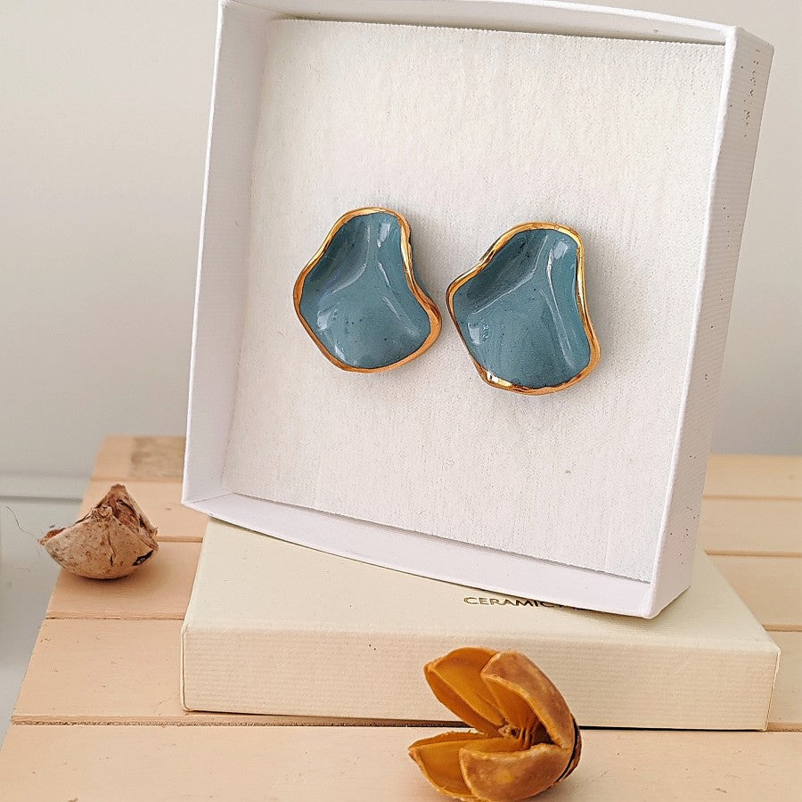 Ove lagane porcelanske minđuše u tirkiznoj boji, uokvirene 14k pozlatom, imaju oblik latice koji odiše elegancijom. Savršene su za svečane prilike, dodajući suptilan i sofisticiran detalj vašem izgledu bez opterećenja. Idealne su za one koji traže jedinstveni, ali diskretan nakit